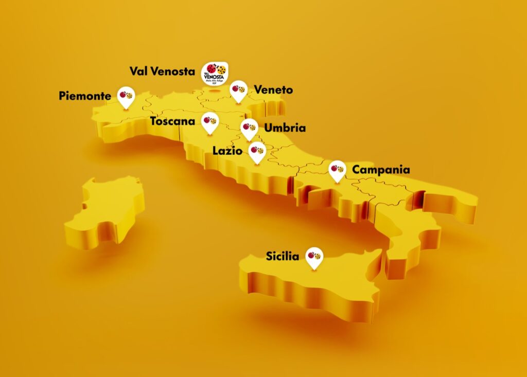 In Veneto, la mela venostana si unirà al formaggio Piave DOP di Belluno, dando vita a un connubio di dolcezza e sapidità; in Campania incontrerà la freschezza e l’aroma del limone, simbolo di leggerezza e vitalità; in Toscana si fonderà con la rusticità dei ceci, espressione di una cucina semplice e genuina; in Piemonte dialogherà con l’intensità del tartufo d’Alba, in un gioco di profumi e contrasti interessanti; e infine, in Sicilia, si lascerà avvolgere dall’aroma profondo e deciso del cioccolato di Modica