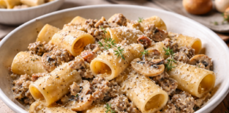 Paccheri al ragù bianco di salsiccia, funghi e crema di Parmigiano