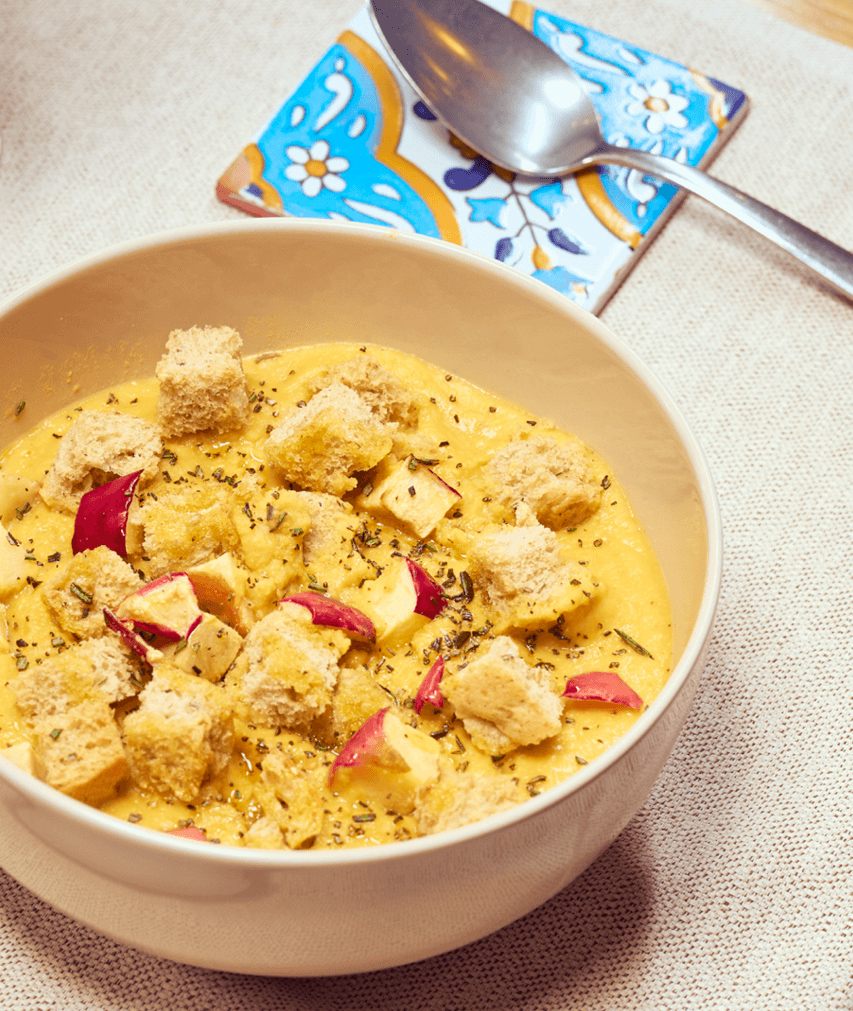 Rimuovere gli aromi e frullare fino a ottenere una crema liscia e vellutata. Completare il piatto con crostini di pane integrale tostato e piccoli cubetti di mela fresca, per un piacevole contrasto croccante.