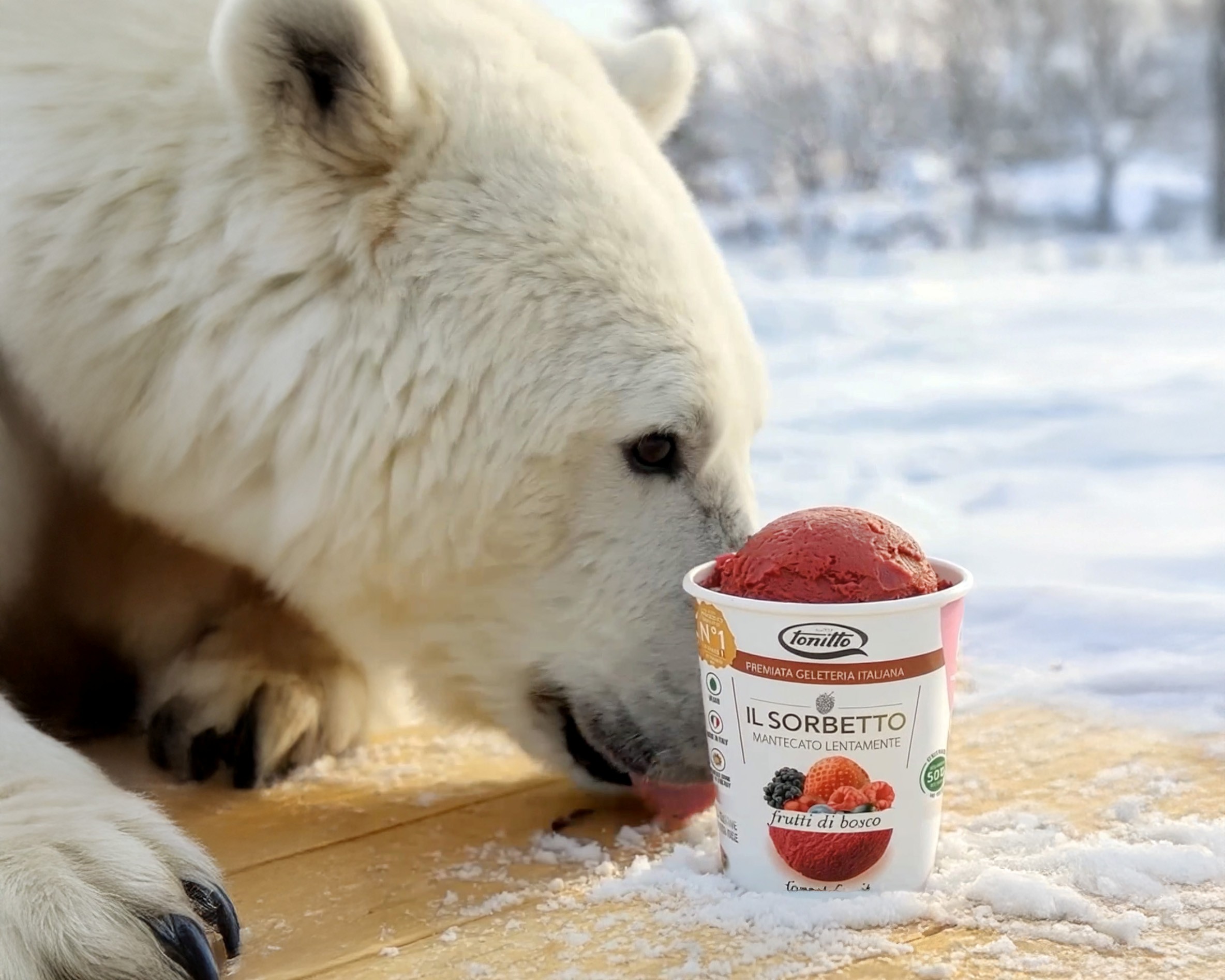 Il film racconta la storia di un orso bianco che attraversa un paesaggio artico innevato e si avvicina a una casa isolata. L’animale viene attirato da un sorbetto Tonitto ai frutti di bosco lasciato su un tavolo nel giardino. La padrona di casa, sorpresa dalla presenza dell’orso, recupera inizialmente il sorbetto, poi, in un momento di complicità surreale, glielo offre per farglielo assaggiare.