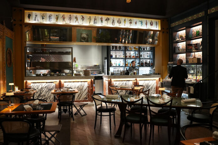 L’interno, progettato da Roberto Antobenedetto Studio, unisce l’imponenza del palazzo cinquecentesco a tocchi di colore e creatività moderna.